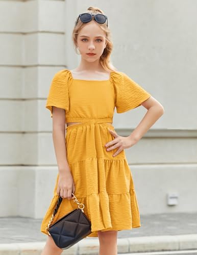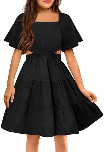 Arshiner Girls Dresses Square Neck Cut Out Shirred Party Cute Tween Dress