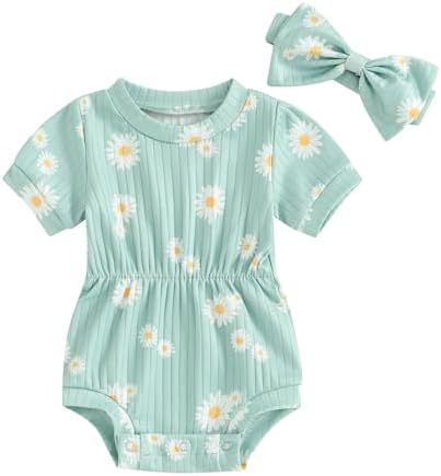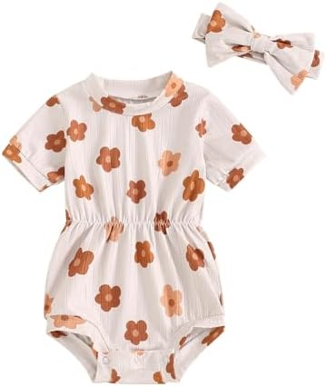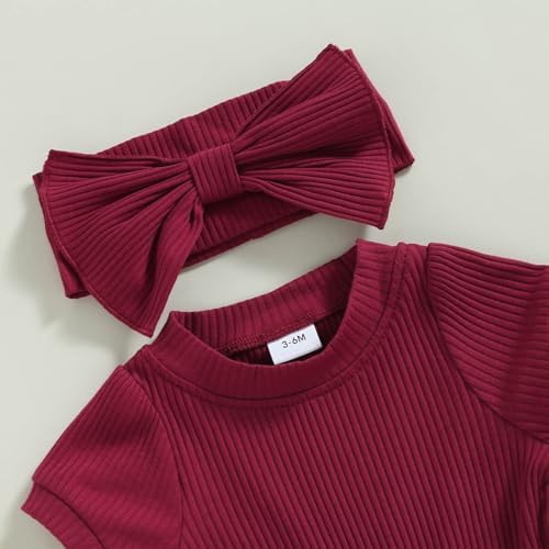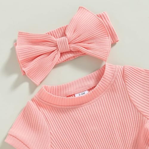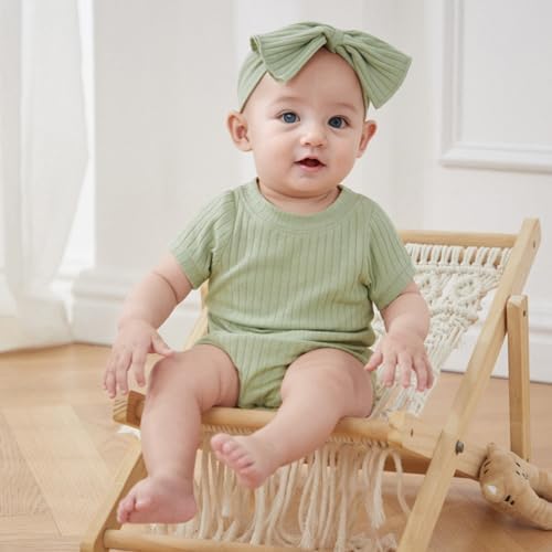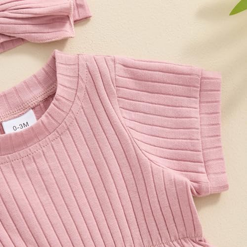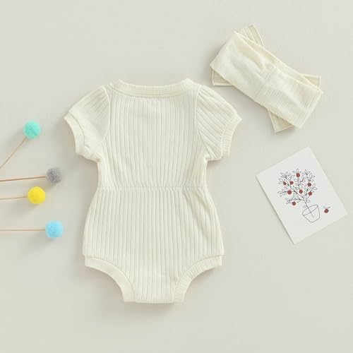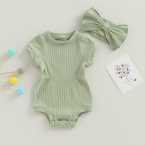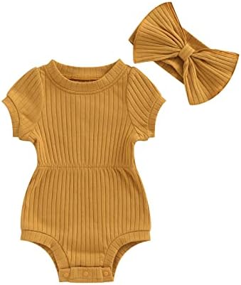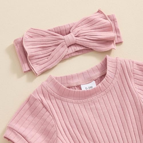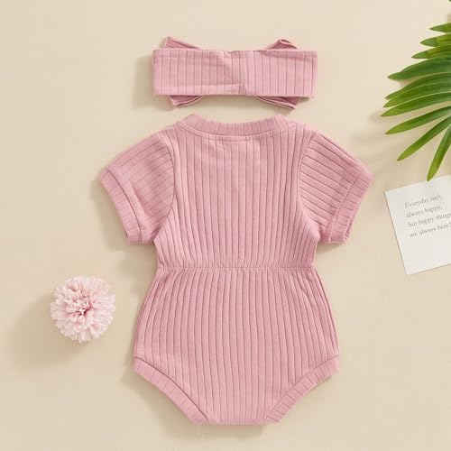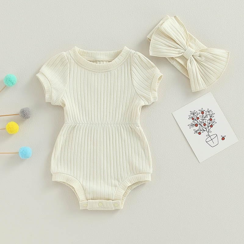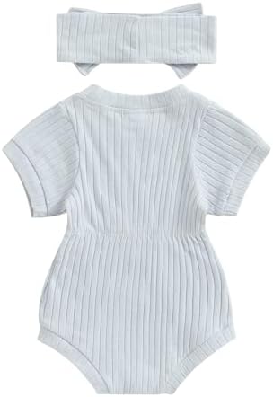 Baby Girl Summer Clothes Ribbed Short Sleeve Romper Solid Color Bodysuits Bow Headband Outfit Newborn Girl Jumpsuit