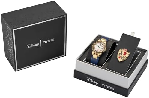 Citizen Ladies' Eco-Drive Disney Princess Snow White Gold Stainless Steel Case with Blue Leather Strap Watch and Pin Gift Set, Pale Gold Dial, Date (Model: GA1079-41W)