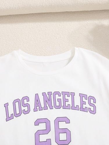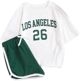 Floerns Girl's 2 Piece Outfits Graphic Print Drop Shoulder Tee & Contrast Binding Track Shorts Clothing Set