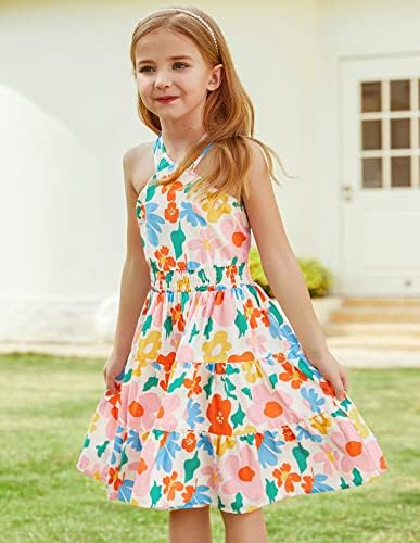 Girls Bohemian Dresses Floral Sleeveless Rainbow Beach Sundress with Necklace 2-12T