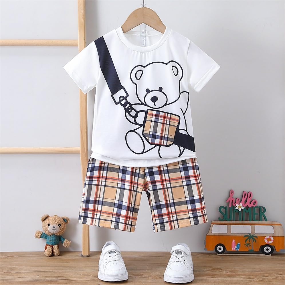 Kids Toddler Boy Clothes Outfits Bear Print Tee + Plaid Shorts 2 Pieces Summer Shorts Set