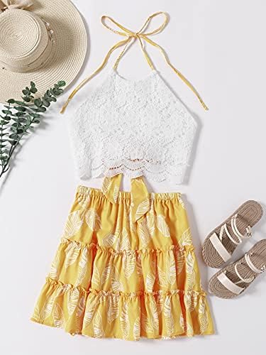 LYANER Women's 2 Piece Outfits Summer Lace Halter Cami Crop Top with Floral Mini Skirt Set