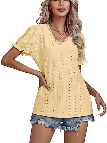 LYANER Women's Casual Puff Short Sleeve Lace Trim Eyelet V Neck Shirt Blouse Tunic Top