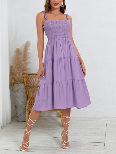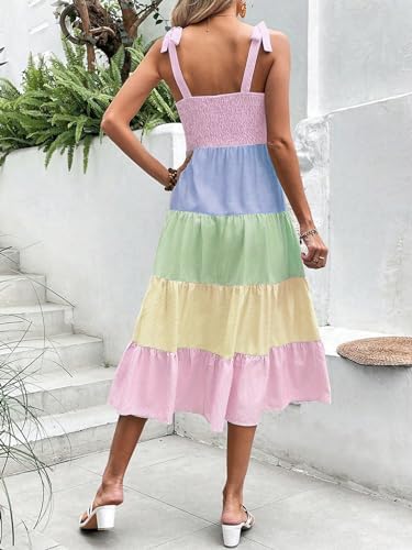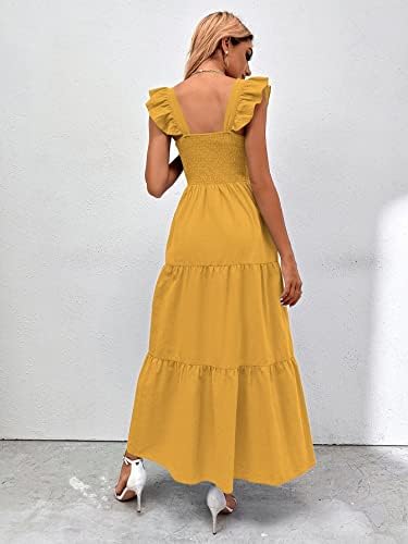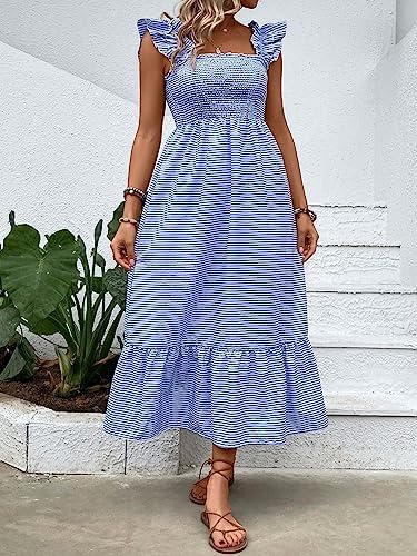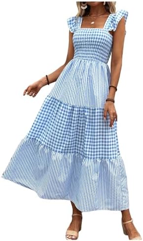 chouyatou Women's Retro Plaid Smocked Dress Spaghetti Strap Flounce Long Dress