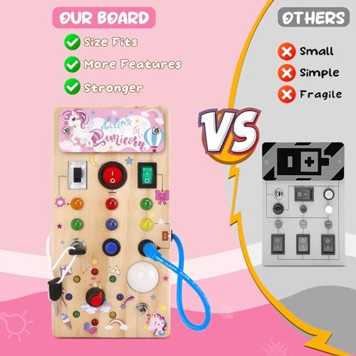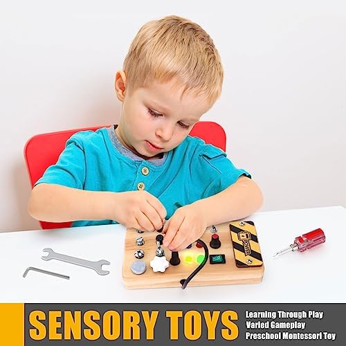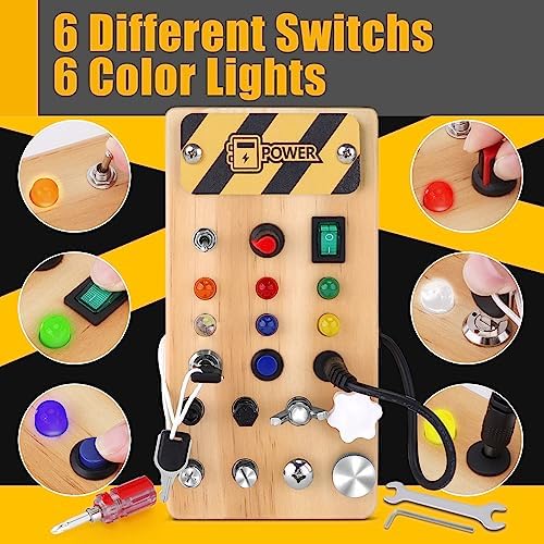 montessori toddler busy board, baby wooden busy board with 8 LED light switches, sensory toys light switch toys travel toys for 1+ year old baby and toddler