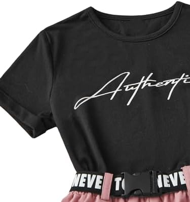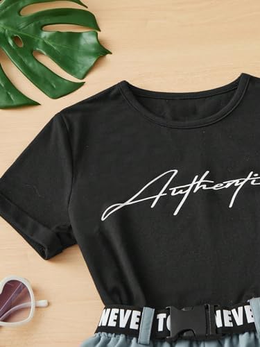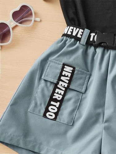 OYOANGLE Girl's 2 Piece Outfits Letter Graphic Round Neck Tee Shirt and Buckle Belted Shorts Set