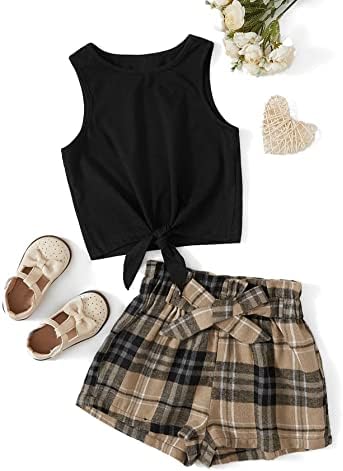 Arshiner Girl's 2 Piece Outfits Tie Knot Tank Top and Paperbag Waist Pocketed Summer Short Sets