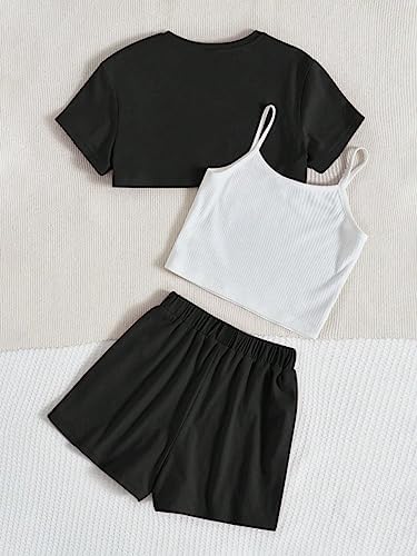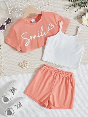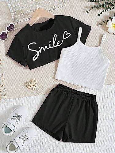 OYOANGLE Girl's 3 Pieces Summer Outfits Graphic Print Crop Tee Top and Cami Top with Shorts Set