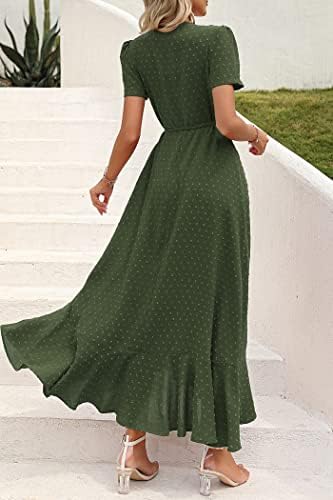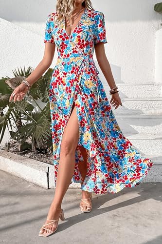 PRETTYGARDEN Womens Summer Wrap Maxi Dress Casual Boho Floral V Neck Short Sleeve Ruffle Hem Split Beach Long Dresses