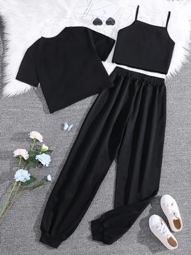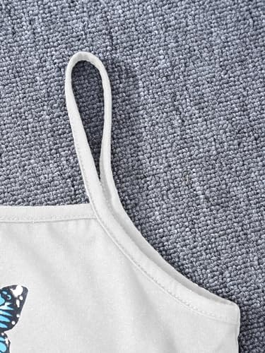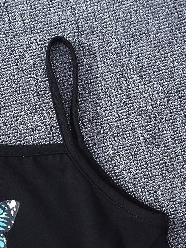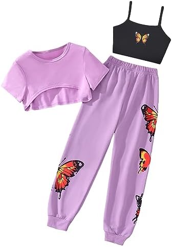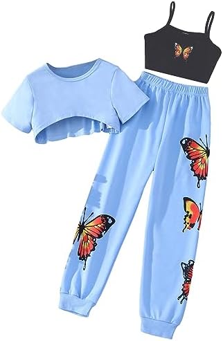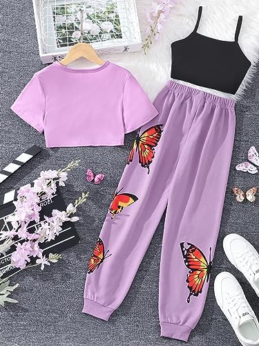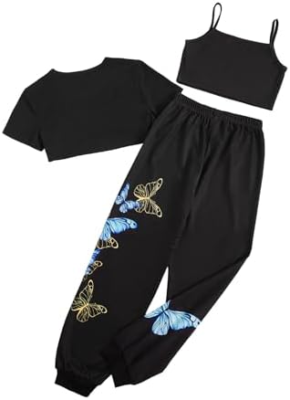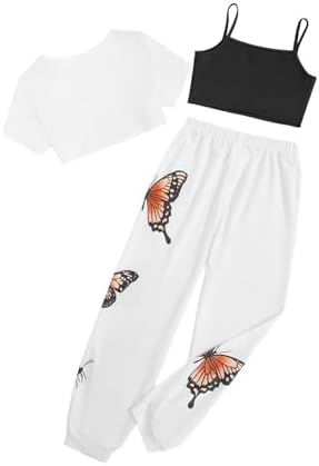 SOLY HUX Girl's Butterfly Print Cami Tops & High Low Hem Short Sleeve T Shirt with Sweatpants 3 Piece
