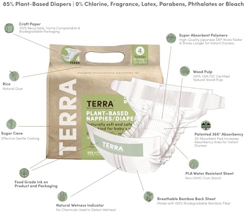 Terra Size 3 Diapers: 85% Plant-Based, Ultra-Soft & Chemical-Free for Sensitive Skin, High Absorbency for 13-24 lb Babies, 20 Count