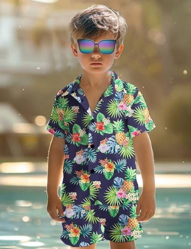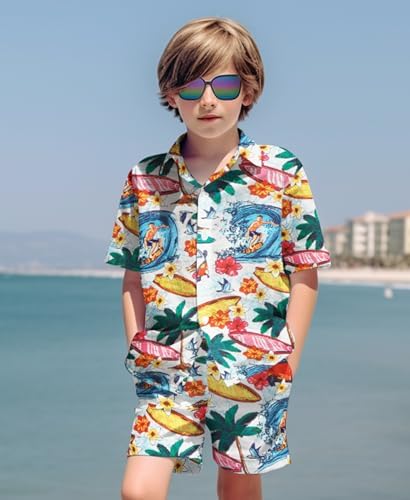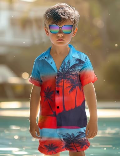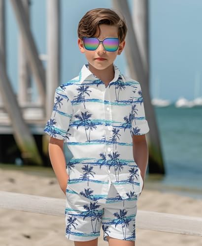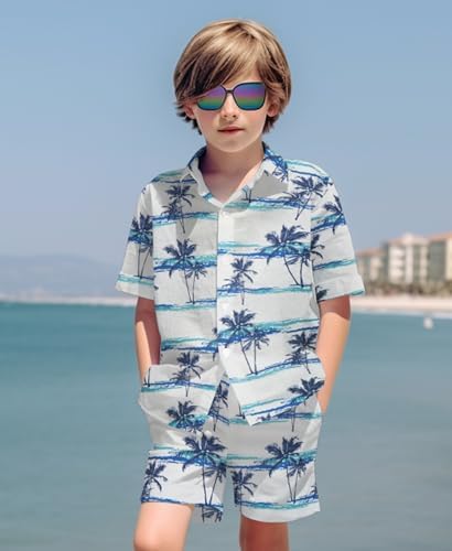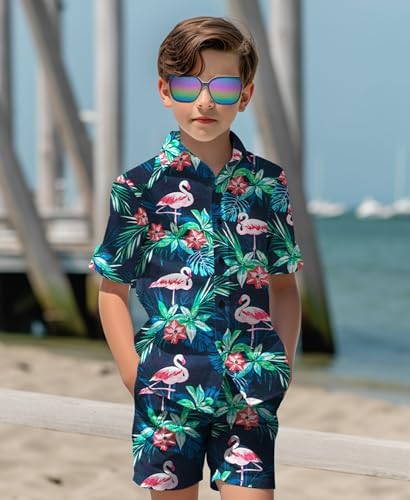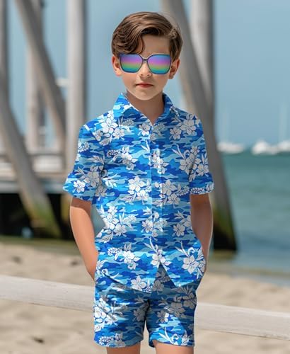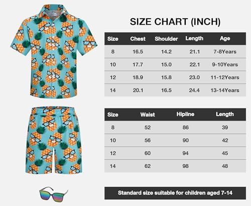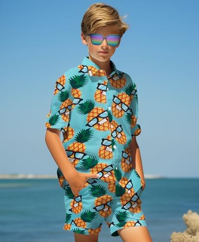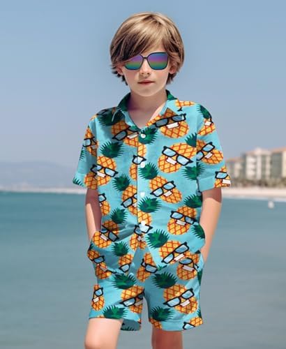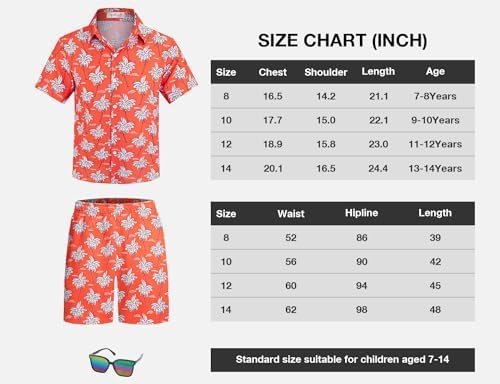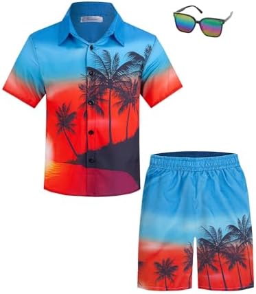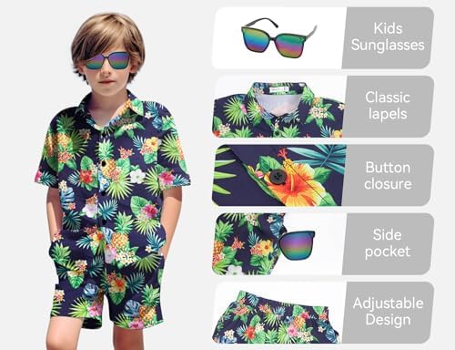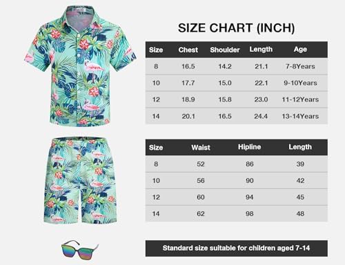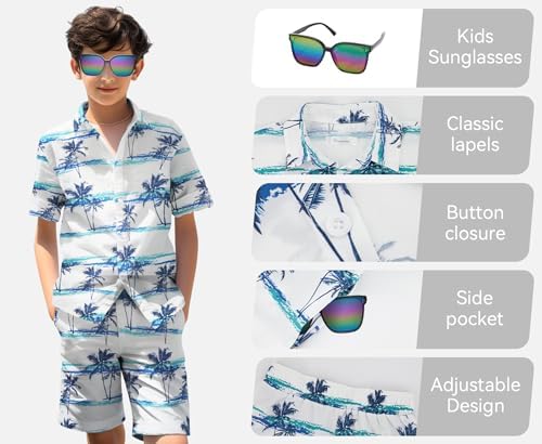 Yoimira Boys Hawaiian Shirt and Short Set Beach Shirts for Kids Printed Casual Outfit 2 Piece with Sunglasses 7-14 Years